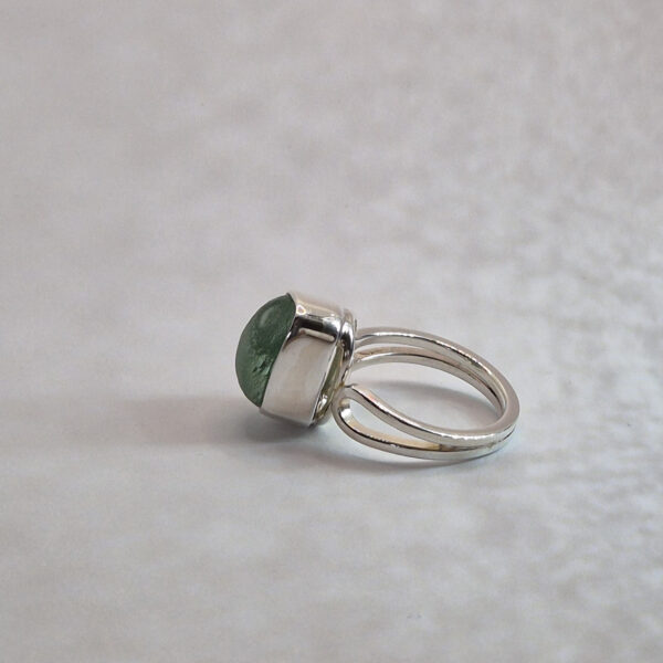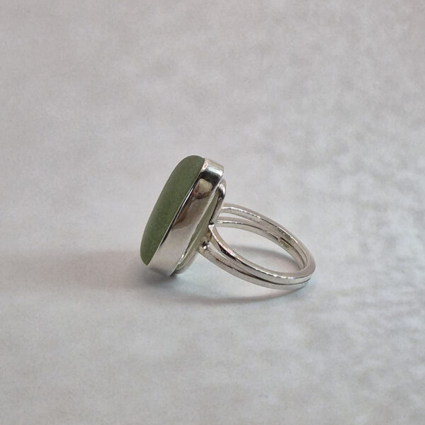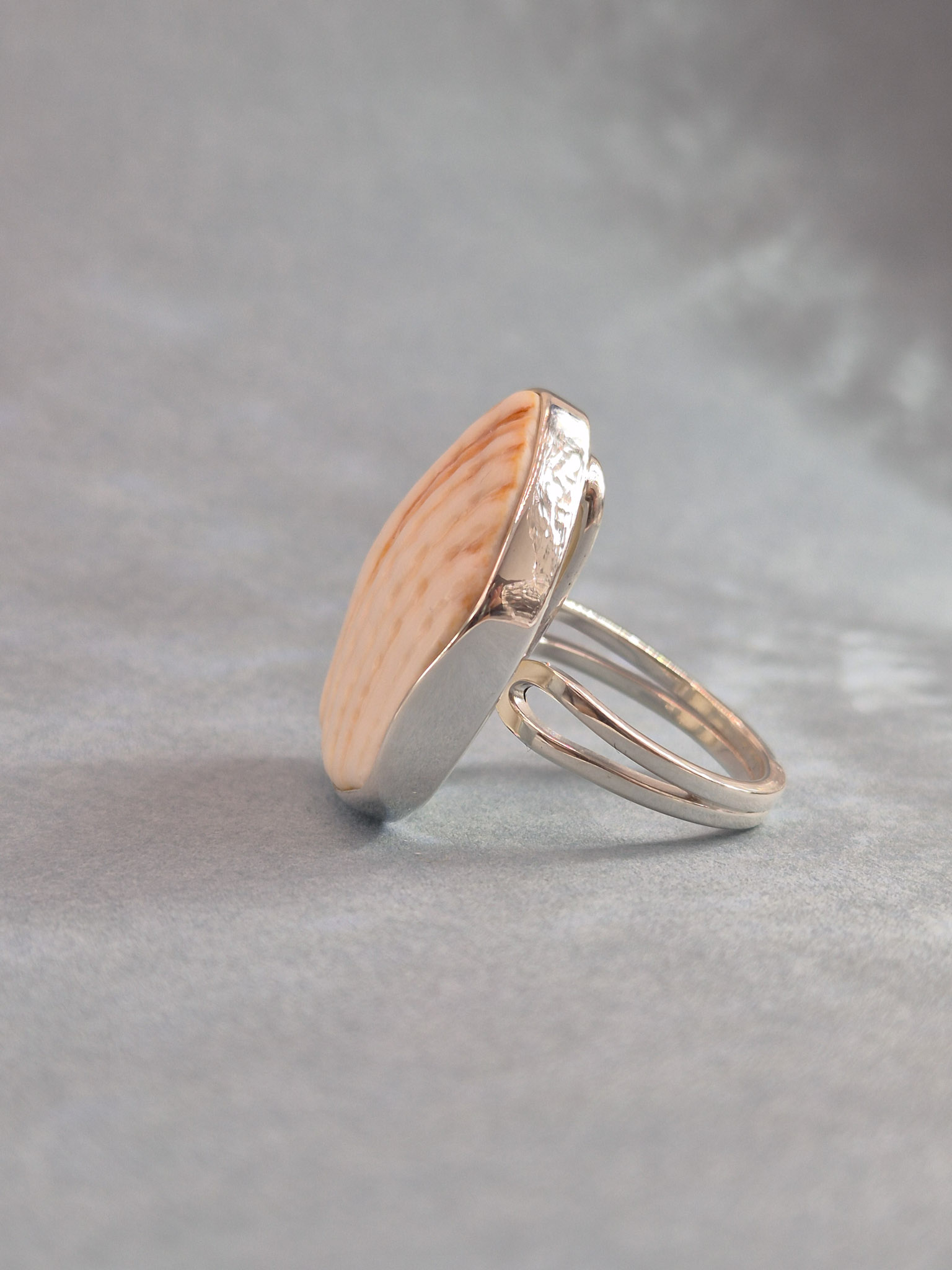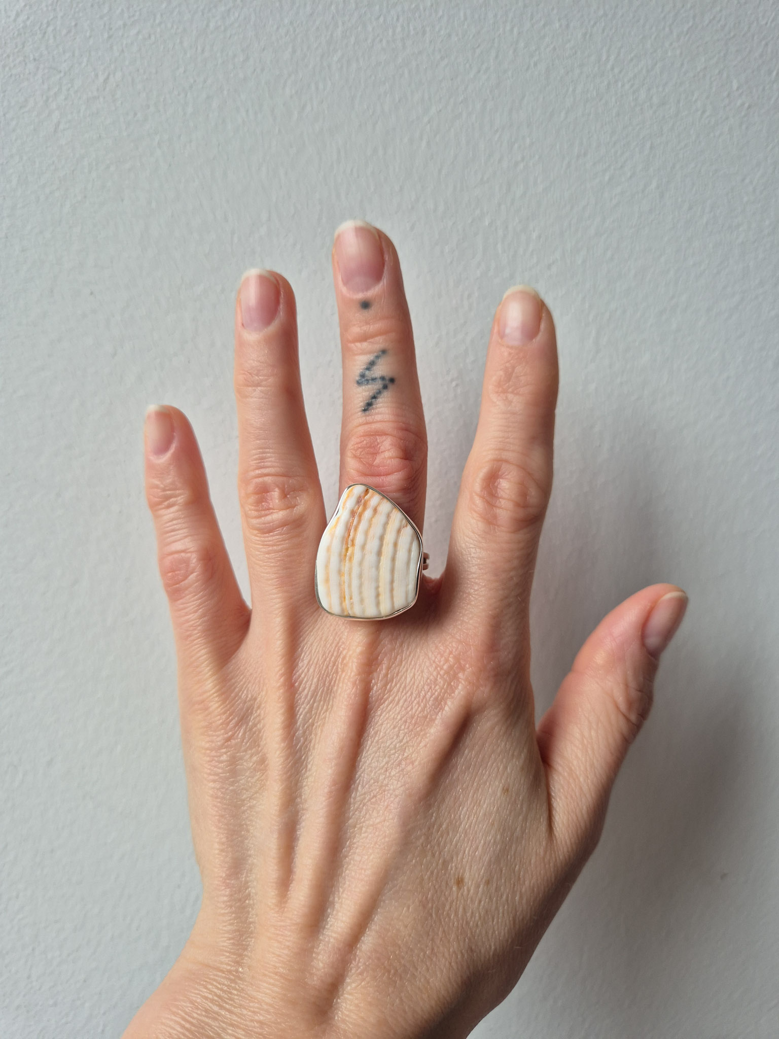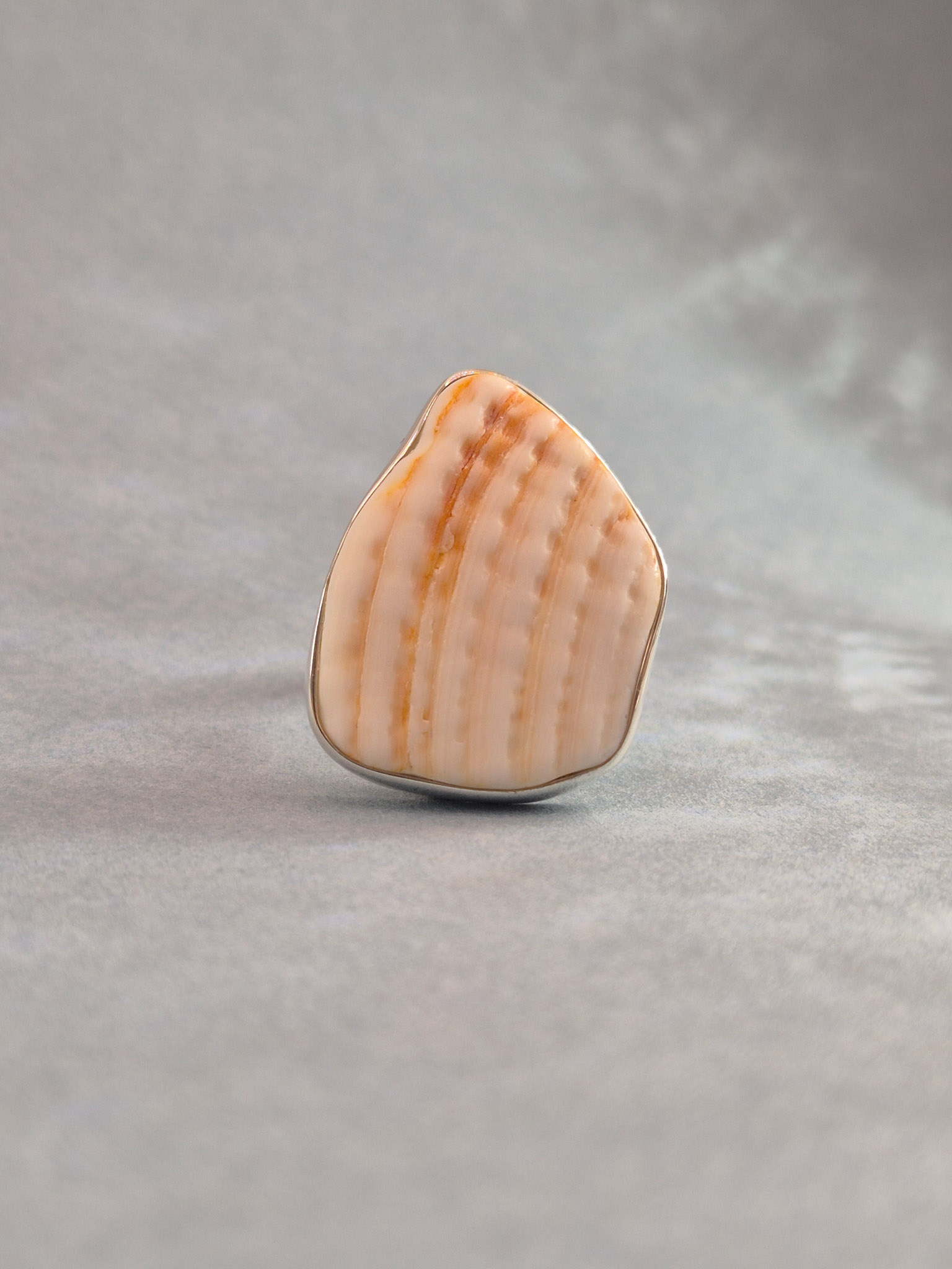 Pierścionek wykonany ze srebra próby 925 z ręcznie oprawioną muszlą. Każdy egzemplarz ma unikalny kształt – starannie dopasowany do kształtu muszelki – co nadaje mu niepowtarzalny charakter.
