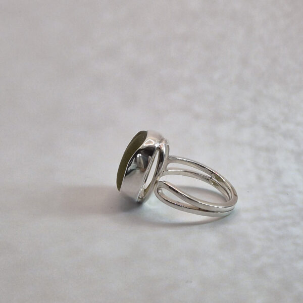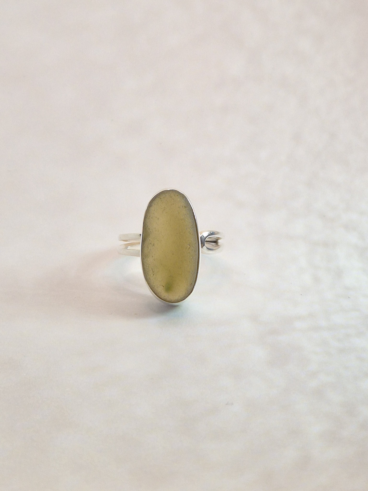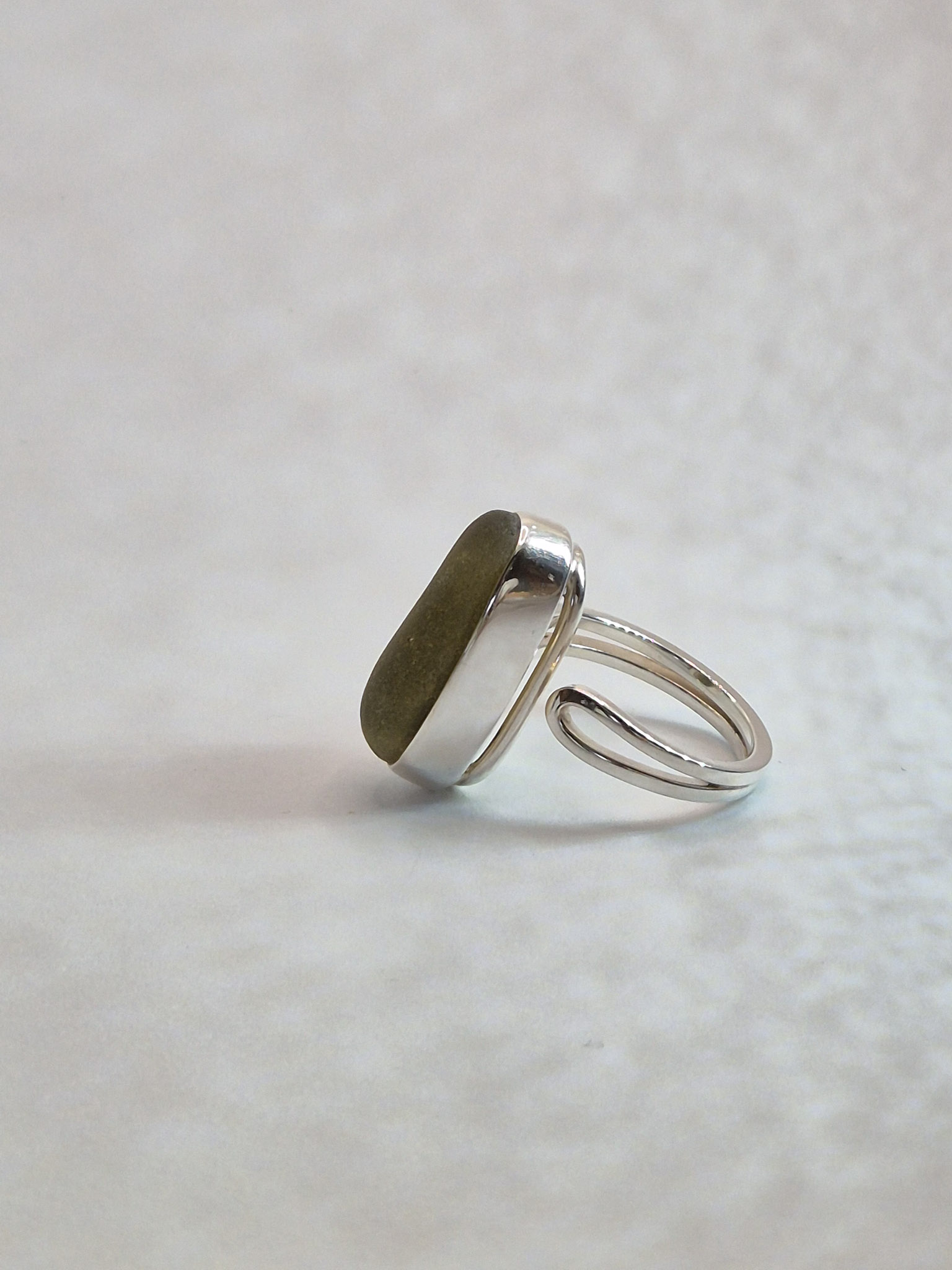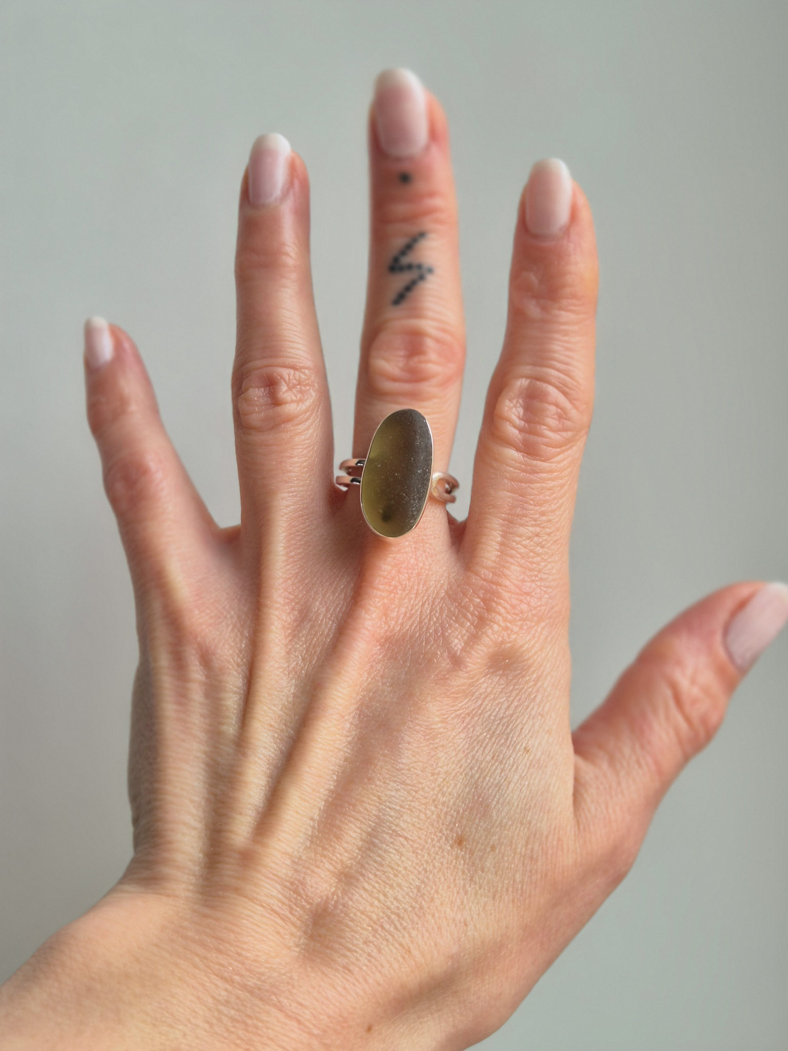 Pierścionek wykonany ze srebra próby 925 z ręcznie oprawionym seaglassem. Każdy egzemplarz ma unikalny kształt – starannie dopasowany do kształtu szkiełka – co nadaje mu niepowtarzalny charakter.