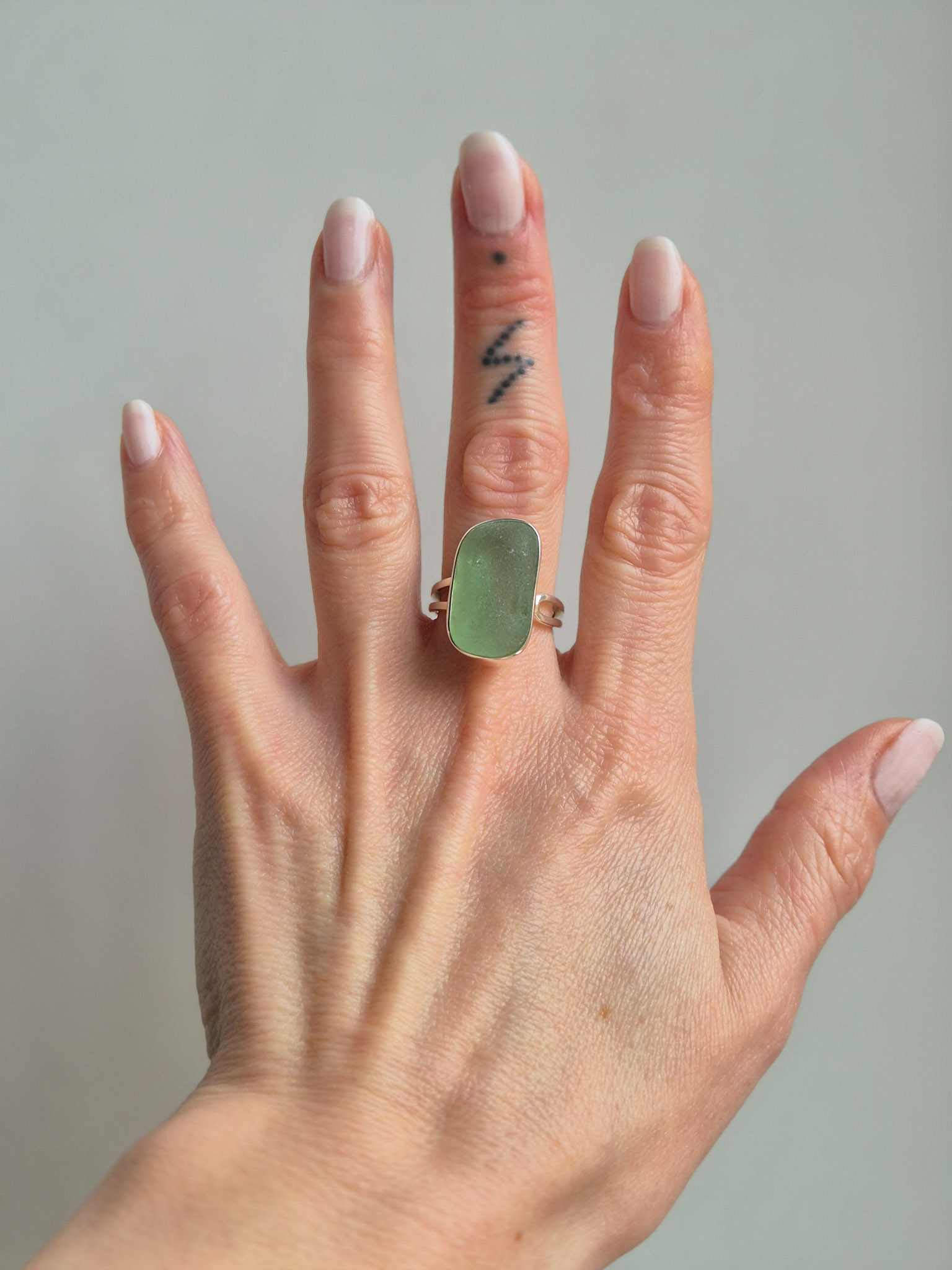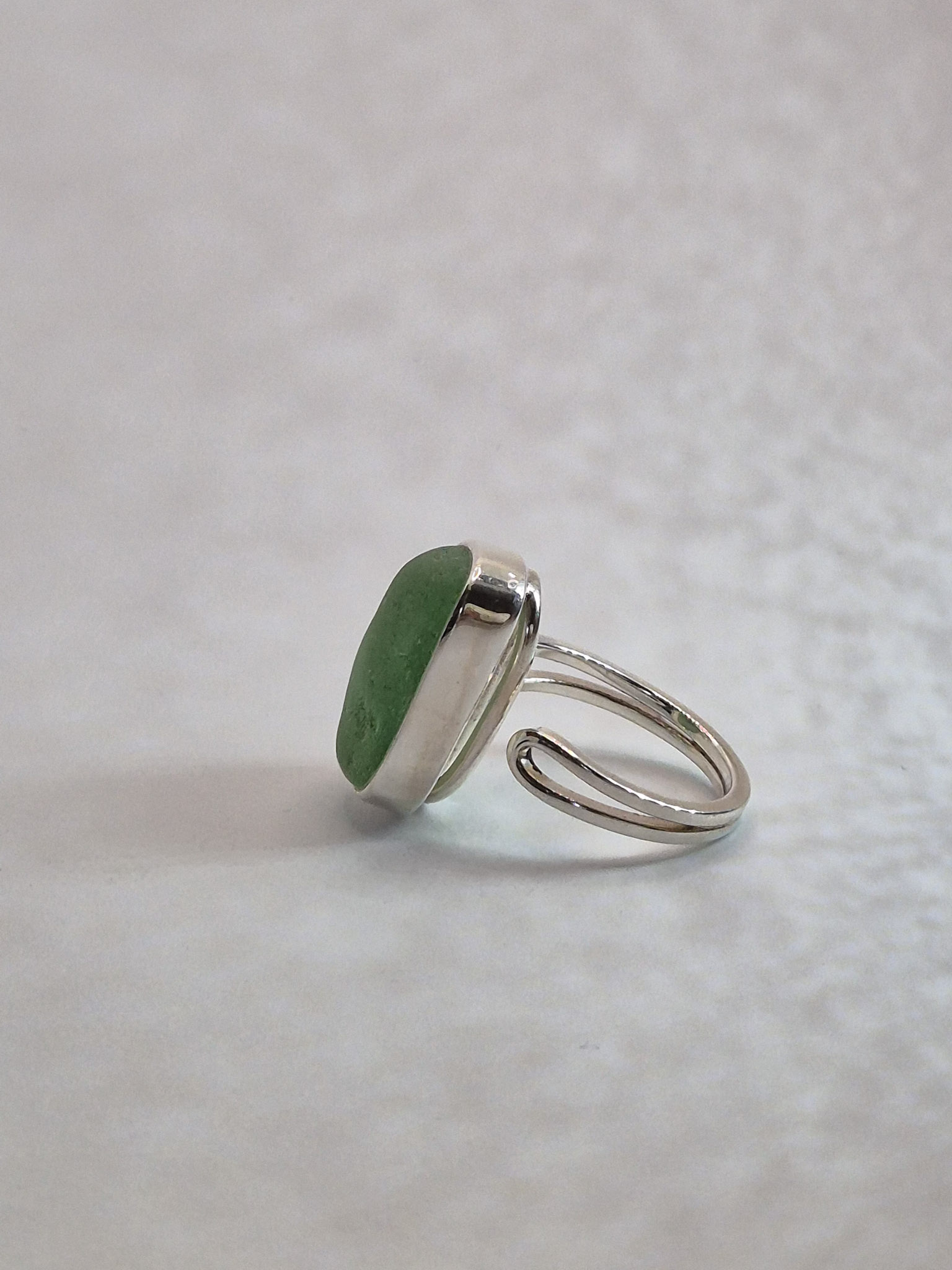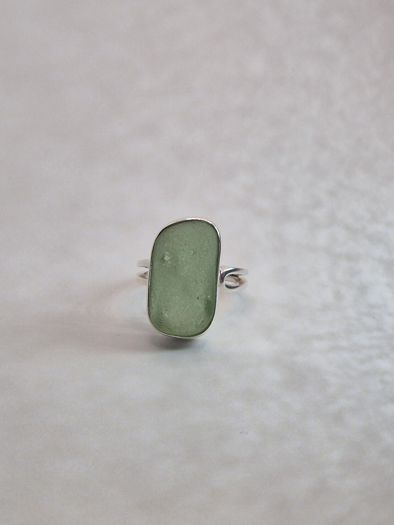 Pierścionek wykonany ze srebra próby 925 z ręcznie oprawionym seaglassem. Każdy egzemplarz ma unikalny kształt – starannie dopasowany do kształtu szkiełka – co nadaje mu niepowtarzalny charakter.