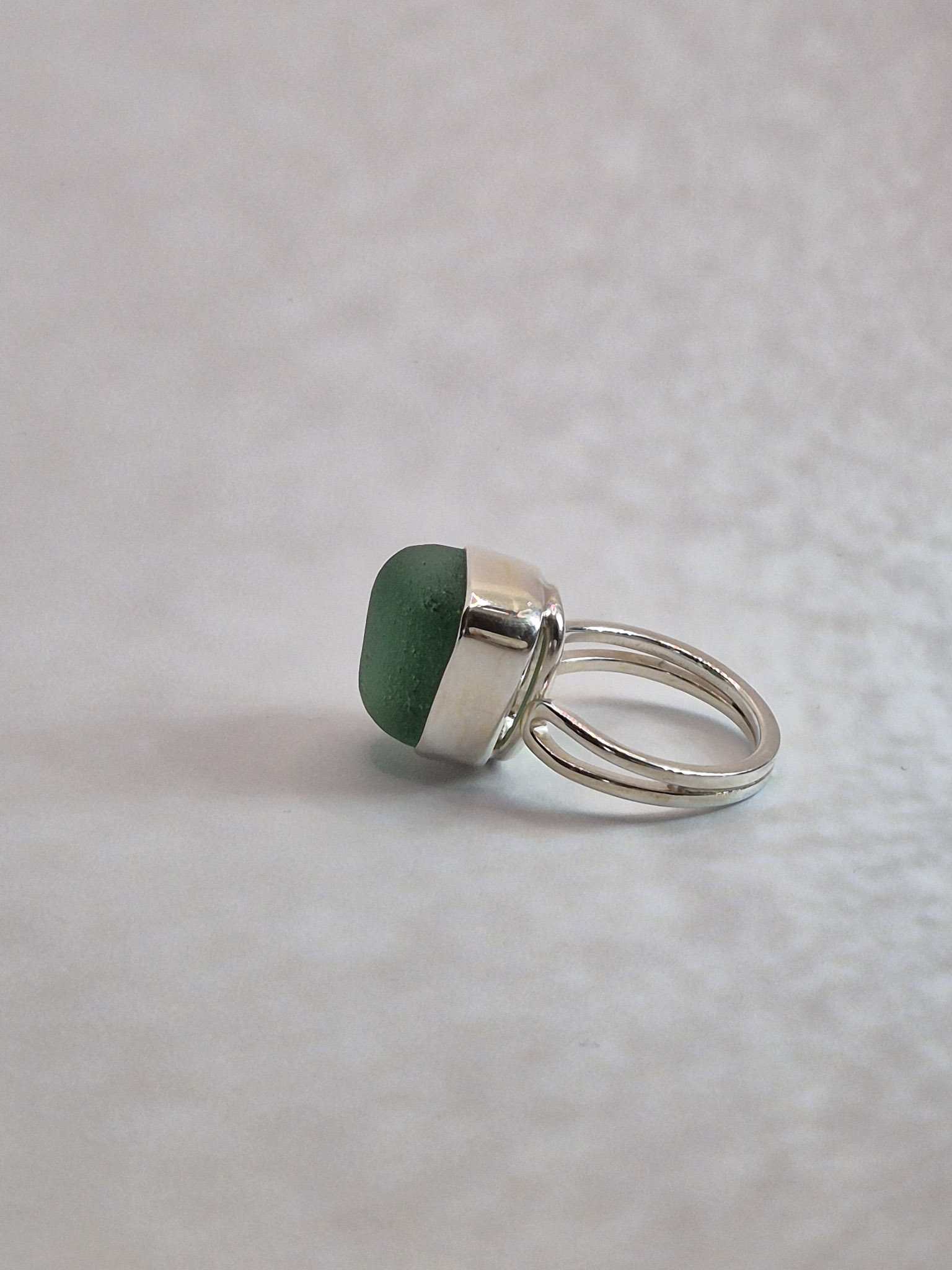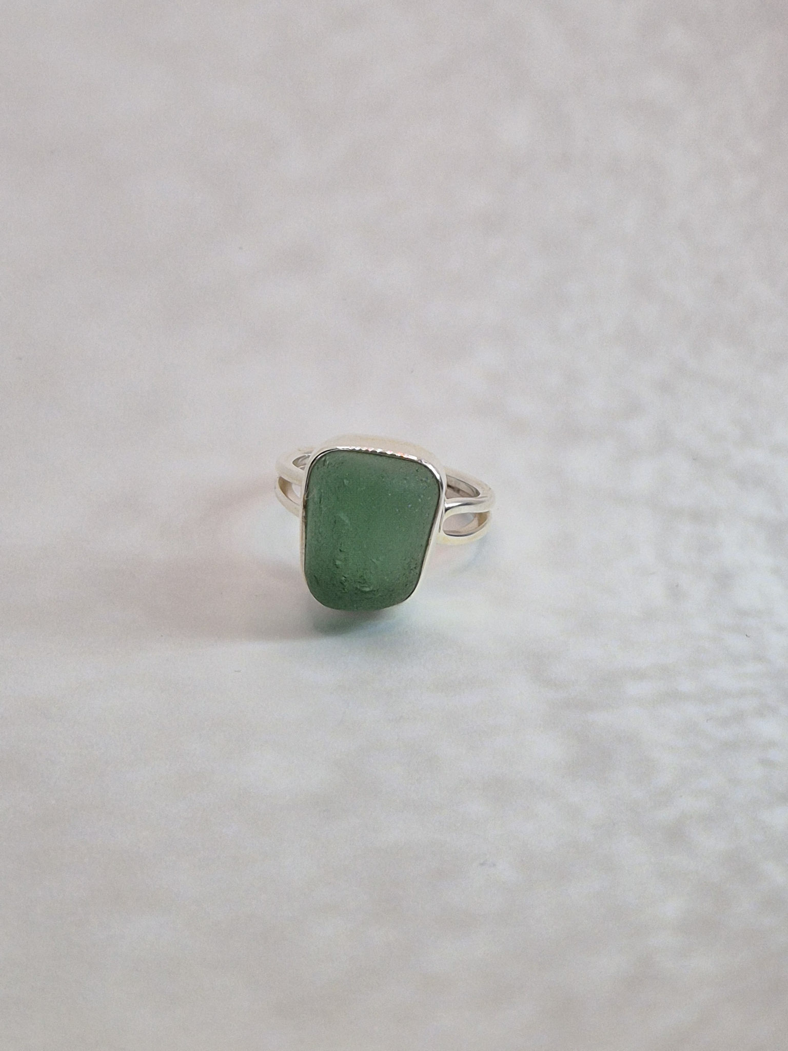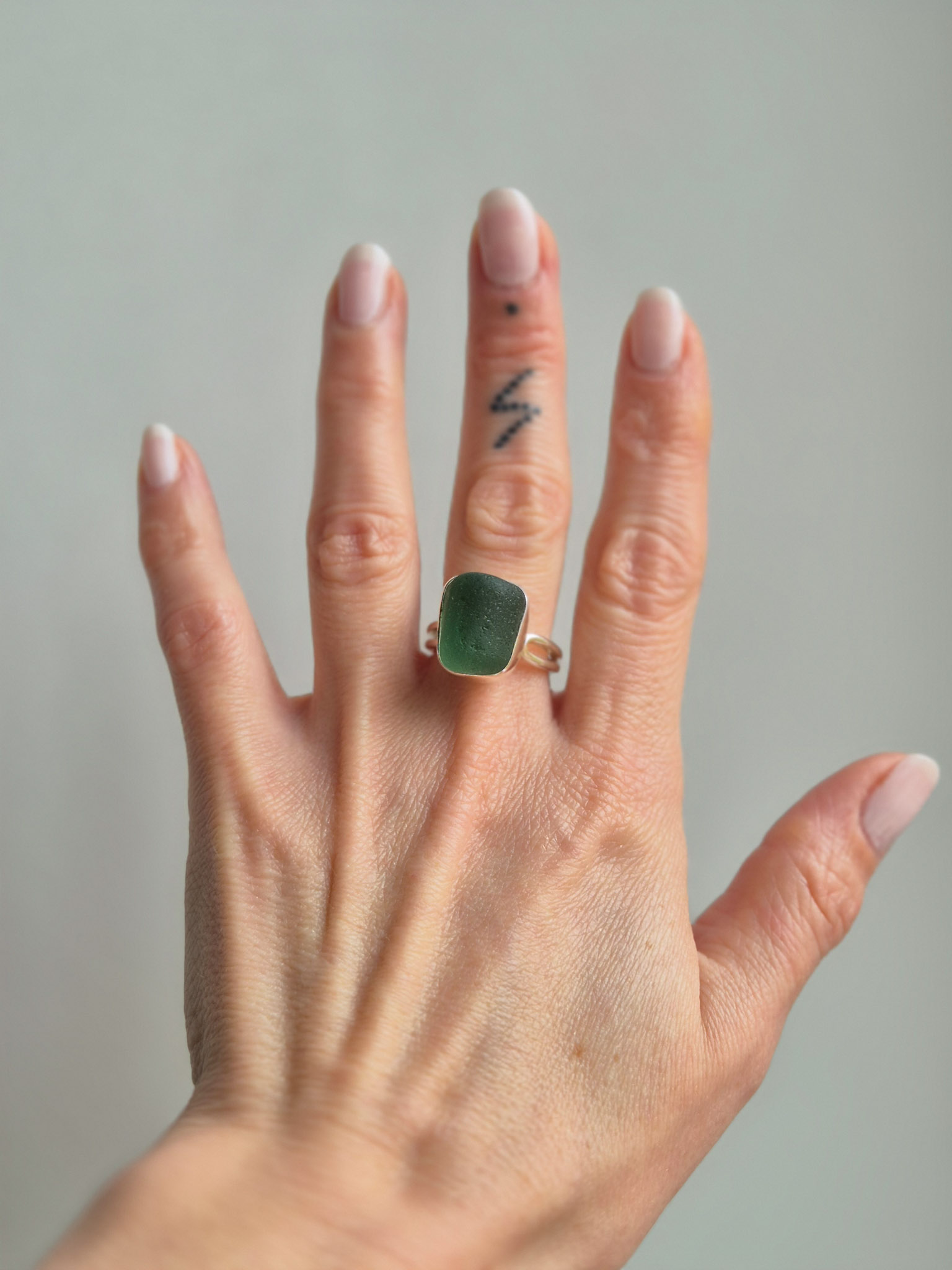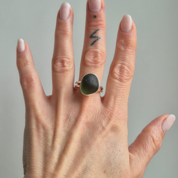 Pierścionek wykonany ze srebra próby 925 z ręcznie oprawionym seaglassem. Każdy egzemplarz ma unikalny kształt – starannie dopasowany do kształtu szkiełka – co nadaje mu niepowtarzalny charakter.