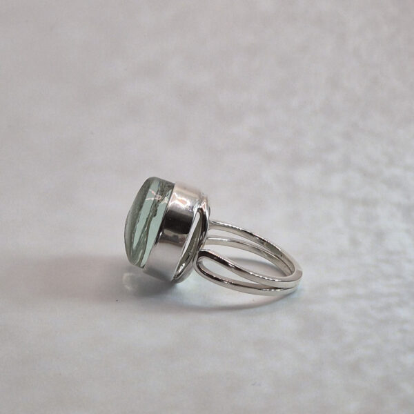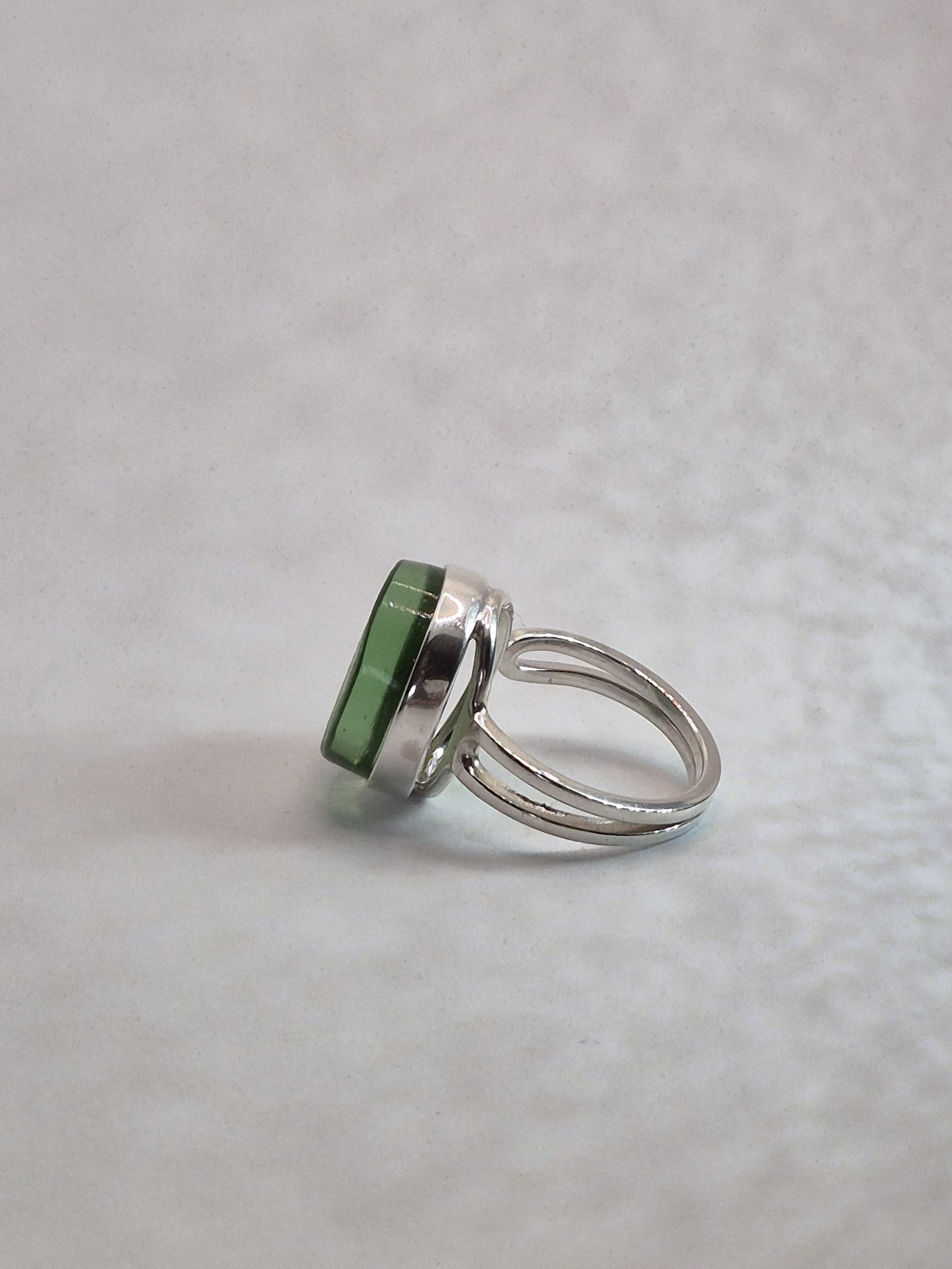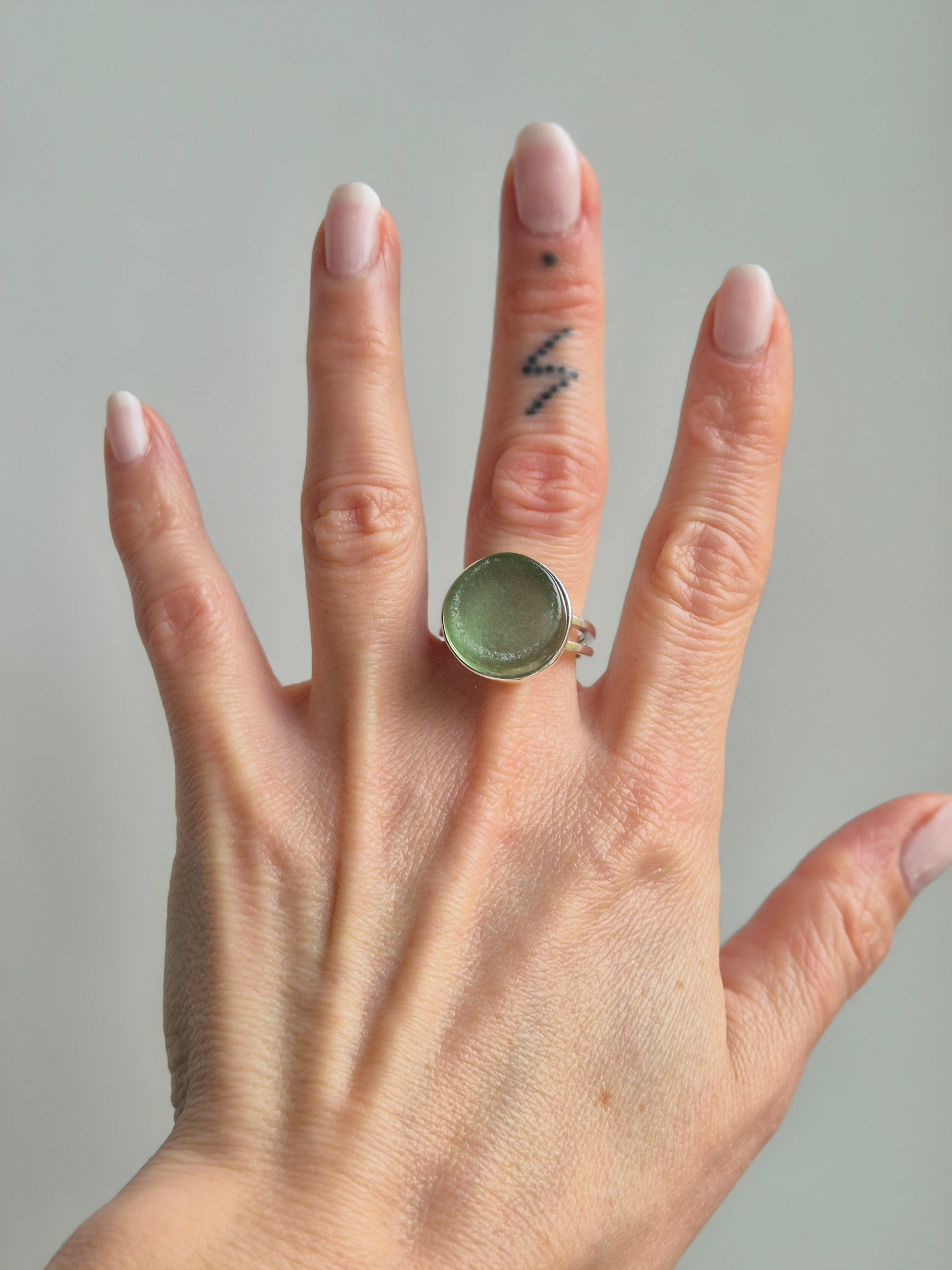 Pierścionek wykonany ze srebra próby 925, z ręcznie oprawionym seaglasem o okrągłym kształcie. Każdy egzemplarz jest unikatowy – naturalne szkło morskie różni się odcieniem i fakturą, dzięki czemu każdy pierścionek ma swój niepowtarzalny charakter.